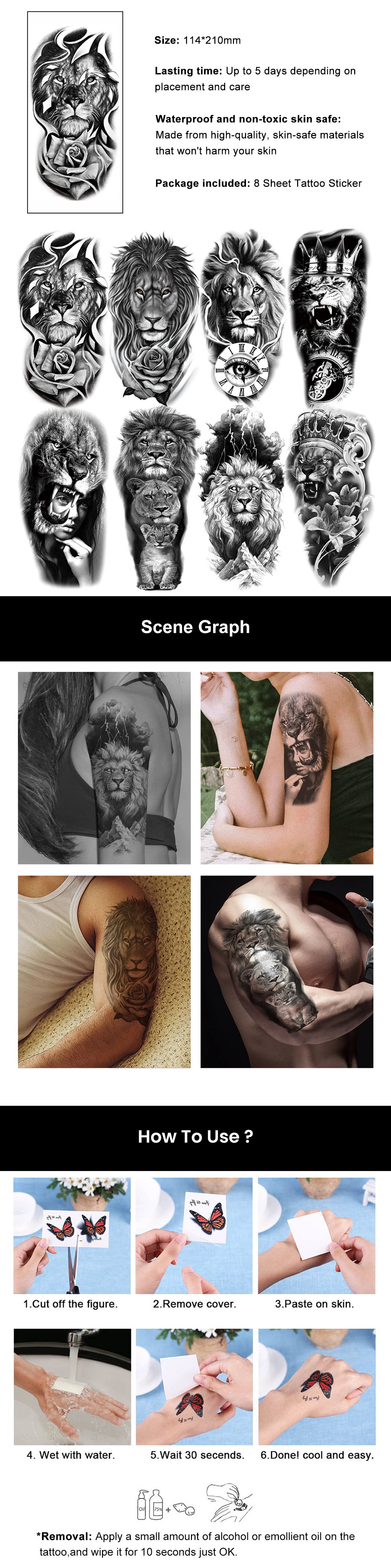 2 Sheets Waterproof Arm Leg Fake Temporary Tattoo - Lion Family Roar Crown Eye Flower Lady