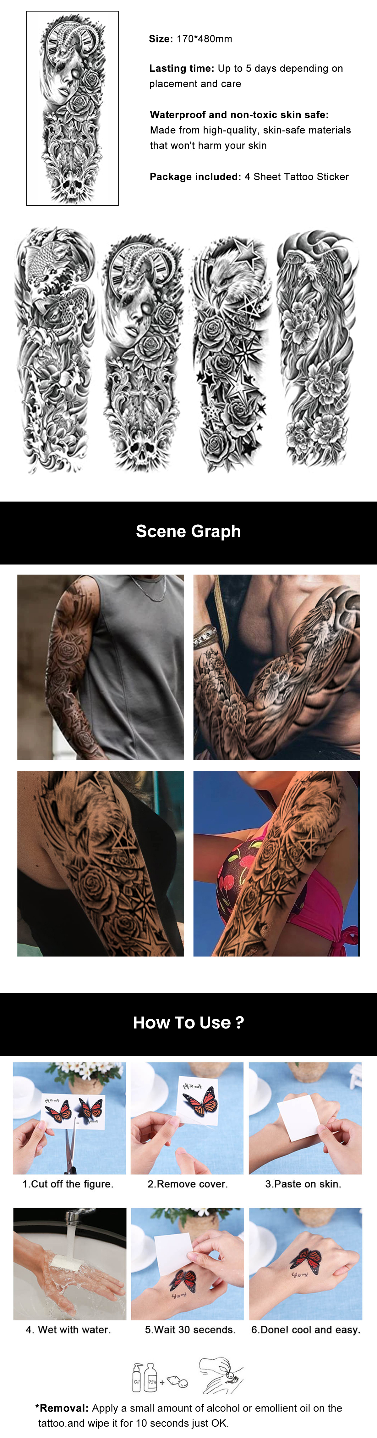 4 Sheets Large Full Arm Leg Temporary Tattoo - Koi Lotus Wave Flower Skull Cross Rose Goat Eagle Star